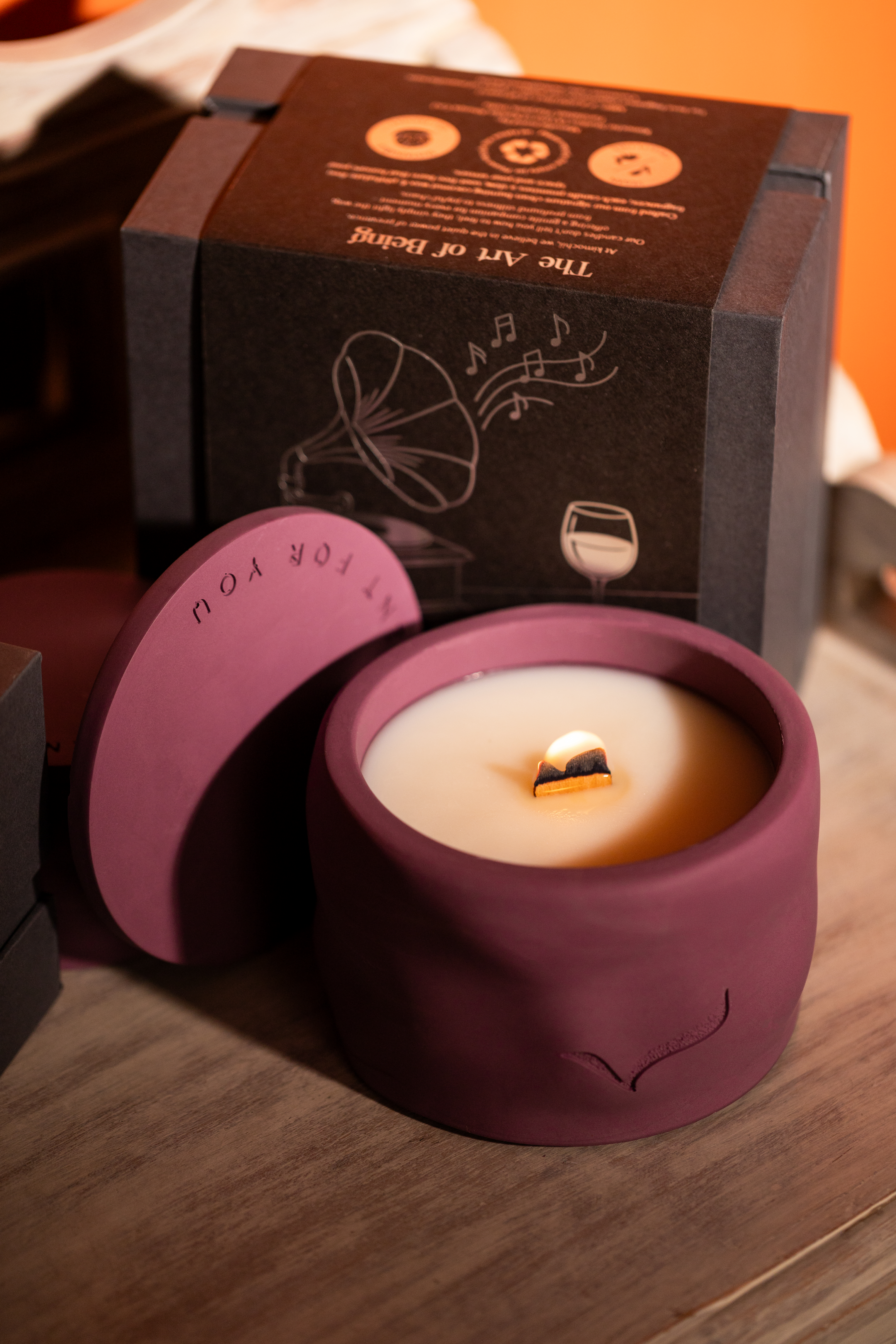 - Velvety coconut wax and a natural wooden wick create a slow, soot-free burn, allowing the artisanal fragrance to reveal its understated richness as a gentle crackle whispers into the room.